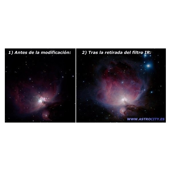 Para poder obtener astrofotografías de calidad es necesario retirar este filtro para que la cámara pueda captar TODA la luz emitida por el objeto a fotografiar, ya que la mejora en la resolución, tiempo de exposición y colores de este tipo de fotografías es espectacular. (observar la gran diferencia en las fotos adjuntas de la nebulosa de orion antes y después de la modificación. Pasando el ratón sobre la foto verás mejor el detalle)