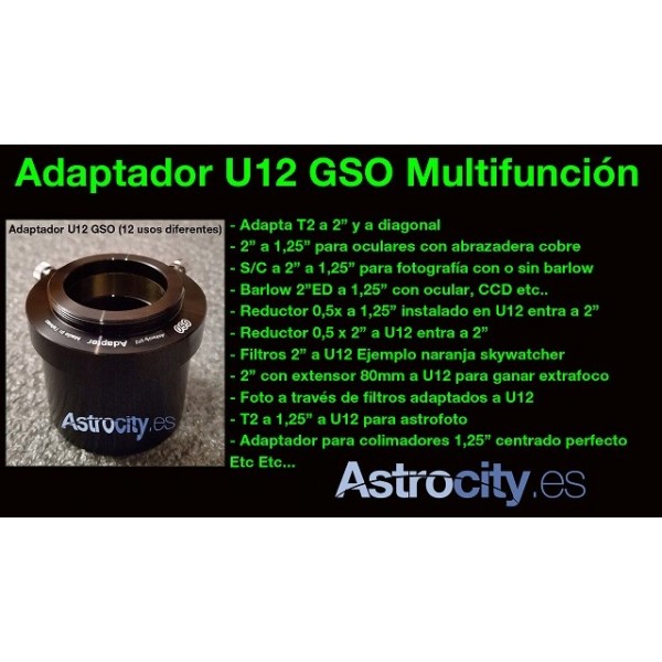 Un adaptador imprescindible con 12 usos. U12 Adapta una reflex al telescopio a 2", reduce de 2" a 1,25" para foto, para oculares, rosca filtros.. Marca GSO auna funcionalidades de varios adaptadores. Más eficaz que adaptadores que apenas dan posibilidades. Con abrazadera de cobre. dos tornillos de cierre y aluminio anodizado.Te recomendamos ver el video!
