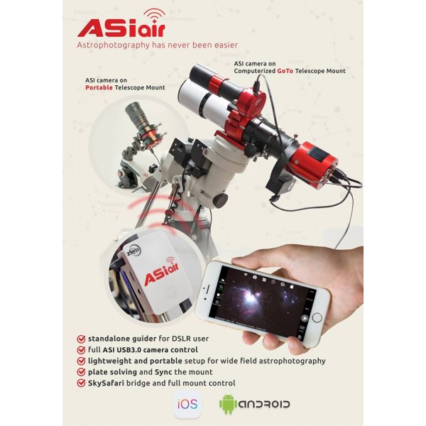 ZWO-ASIAIR es un revolucionario y novedoso sistema de control Wifi inteligente y multifunción de Zhen Wan Optics. que actúa como controlador de diversos dispositivos simultáneamente, ofreciendo la posibilidad de visualizar las imágenes en tiempo real en la pantalla del móvil o de la tablet, permitiendo también la transferencia de las mismas a un PC mediante tarjeta de memoria (Micro SD)