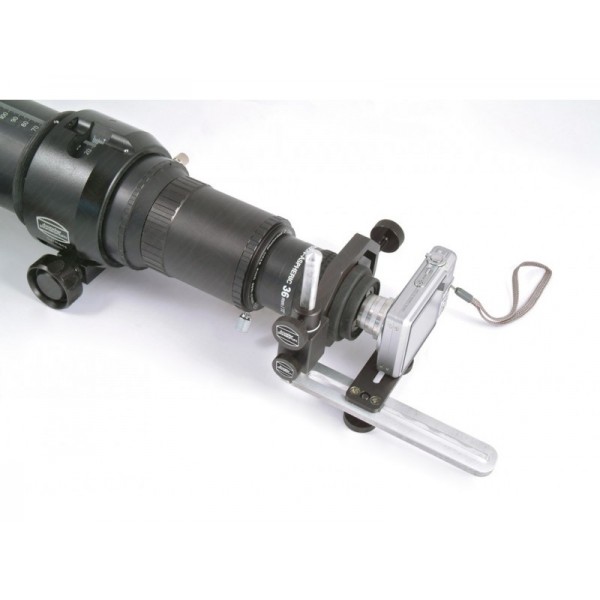 Soporte universal Baader Planetarium para cámaras digitales. Haz fotografía terrestre o planetaria a través de tu telescopio con cualquier cámara compacta. Acopla la cámara de forma segura y precisa para hacer fotografía a través del telescopio. Adaptable a cualquier modelo de cámara, telescopio y ocular del mercado.