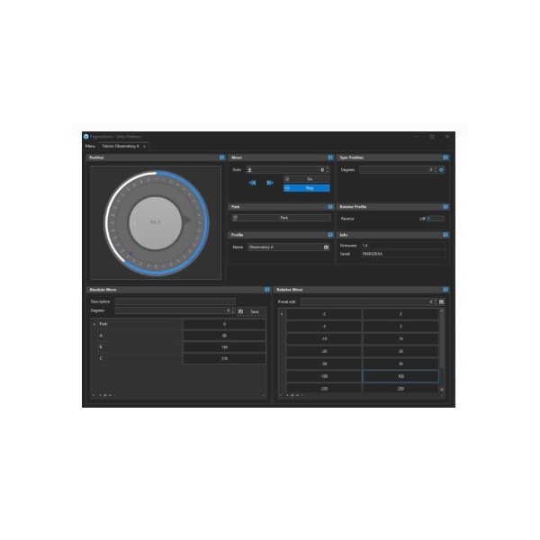 Una de las funciones mas novedosas de este rotador es su capacidad de desrotar el campo. Podremos hacer fotos de larga exposición o de corta exposición sin que el campo rote en telescopios con montura altacimutal.