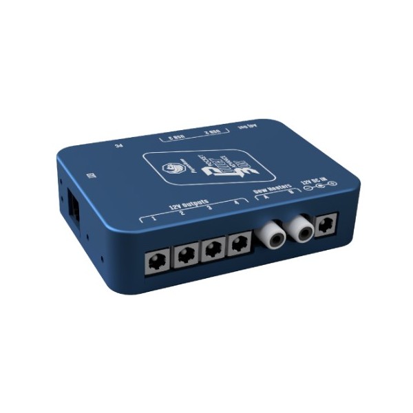 En el otro lateral tiene 2 conexiones RCA donde podremos conectar 2 cintas calentadoras que podremos controlar su potencia a través de la aplicación también. También en este lado tiene 4 salidas jack 5,5x2,1 de 12V que podremos encender y apagar en remoto también. Y la conexión entrante de 12V que alimentará el propio dispositivo y cada una de las salidas de 12V de este.