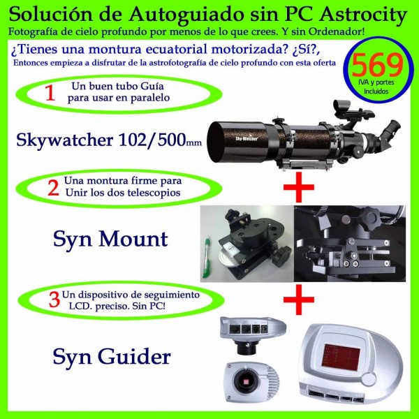 Kit de autoguiado para astrofotografía de cielo profundo. Un tubo guía 102/500mm black Diamond, un Synmount para poner los dos tubos en paralelo, sin necesidad de abrazaderas ni apliques. Y un Synguider para guiar sin PC. Con un LCD que te permitirá seguir una estrella y hacer largas exposiciones, para captar toda la luz de nebulosas, galaxias, clusters etc..