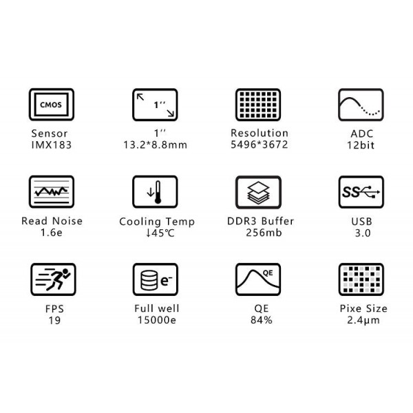 - Sensor: CMOS IMX183CLK-J / CQJ-J de 1" Mono