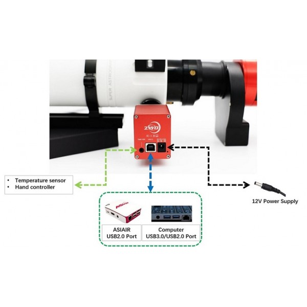 La nueva versión se puede conectar directamente a una cámara, ordenador, o ASI-AIR PRO por medio de USB 2.0 usa 5V
