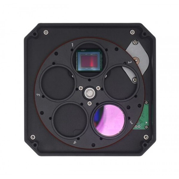 La nueva cámara refrigerada ASI 183 Monocroma GT incorpora dentro de la carcasa de la propia cámara una rueda porta filtros electrónica de 5 posiciones ultra silenciosa, conservando todas las prestaciones y el excelente rendimiento de su predecesora la ASI 183 MM.