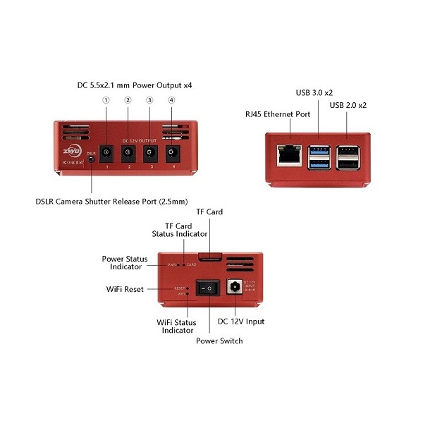 Está equipado con un módulo de administración de energía liviano.Incorpora 4 salidas de potencia DC 5.5 x 2.1 mm en el lateral del dipositivo, un puerto de liberación del obturador DSLR, dos puertos USB 2.0 y 2 puertos USB 3.0. La fuente de alimentación es estable y segura, el cableado se ha optimizado y simplificado y la interfaz es intuitiva.