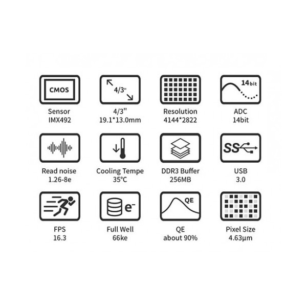Con un sensor mono de 4/3" cuya resolución es de 4144 x 2822 píxeles y 11,7 millones de píxeles, esta pensada para hacer astrofotografia de cielo profundo pero es a su vez valida para proyección de imagen planetaria y autoguiado.
