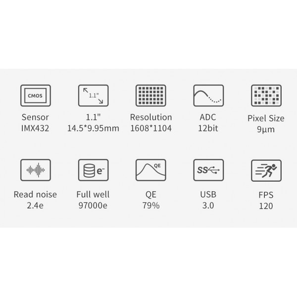 ZWO ofrece en la nueva ASI 432 MM, una mejora general de prestaciones, siendo una cámara muy sensible, con una eficiencia cuántica del 79%, gran velocidad de captura y un bajo ruido de lectura (2,9e)