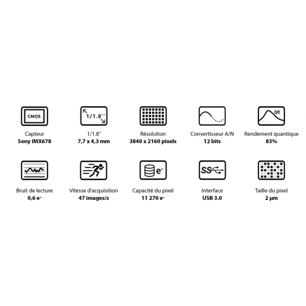Es una cámara de alta sensibilidad con una eficiencia cuántica de hasta el 81%, un bajísimo ruido de lectura (0,6e) y ausencia total de electroluminiscencia.