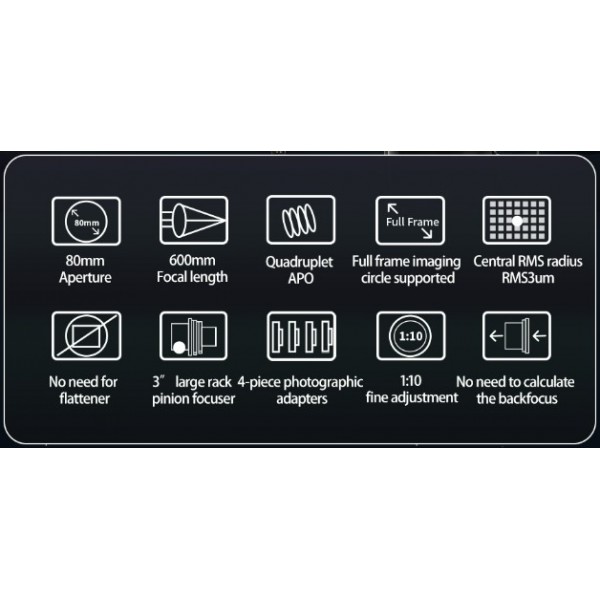 El ZWO FF80 APO es un telescopio refractor astrógrafo cuadruplete con un poderoso diseño óptico de campo plano que le ahorrará el aplanador de campo. Elimina el problema de calcular la distancia del aplanador (metalback) y meter anillas espaciadoras para conseguir la medida y tener el campo plano, como sucede con los tripletes comunes.