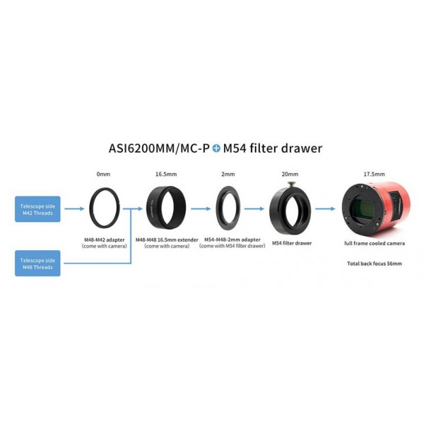 Permite colocar filtros montados de 2" entre la cámara y el telescopio. Apto para cámaras ASI6200MM, ASI6200MC y 2600MC Duo, ya que tienen rosca M54. Por un lado rosca al telescopio al adaptador M54x0,75 y por el otro a la cámara mediante rosca M54x0,75. Garantiza una sencilla instalación del filtro, así como una cómoda extracción y fijación del mismo durante el uso. Marca ZWO.