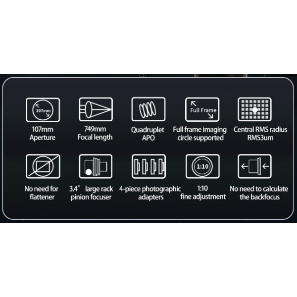 Tiene una apertura de 107mm. La relación focal es f/7 y la distancia focal es de 749mm.