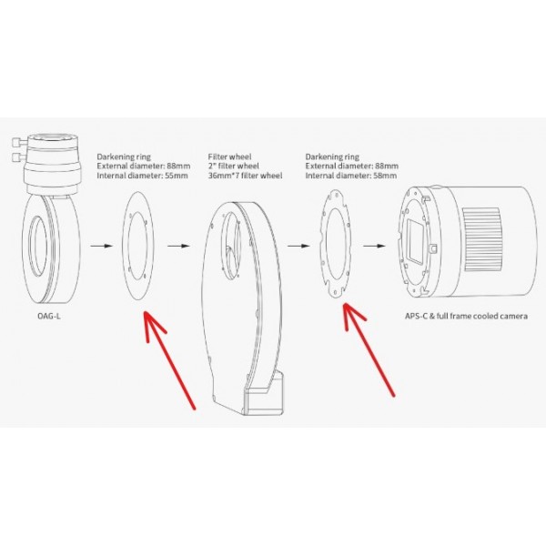 Estos anillos se ponen entre las cámaras y las ruedas y entre las OAG y las ruedas, para evitar intrusiones parásitas de luz.