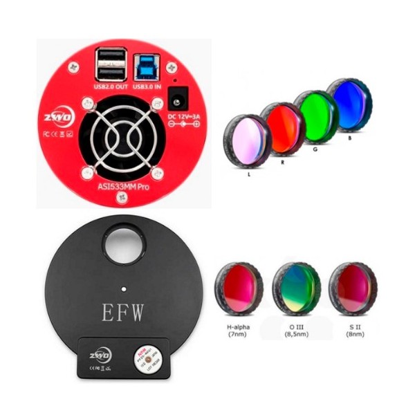 · Los filtros de banda ancha y banda estrecha son necesarios cuando la cámara es monocroma. Esta cámara, la ASI533MM, por su tamaño del sensor, funciona bien con filtros de 1,25”. Los filtros Baader LRGB CMOS Optimized son unos filtros de alta calidad a precio muy competitivo. Sirven para hacer fotos a nebulosas de reflexión, como las Pléyades y la Iris, y a galaxias, IFN, nubes de polvo, gas y y cúmulos estelares. Los filtros de banda estrecha (hidrógeno, oxígeno y azufre) valen para hacer fotos de nebulosas de emisión. Su paso de banda es de 6,5nm. Y todos los filtros son de 1,25” roscados.