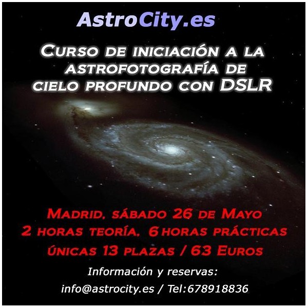 El 23 de Noviembre de 4pm a 1am. VIII edición del curso de iniciación a la fotografía de cielo profundo. Repasaremos el proceso completo, y ponerlo en práctica. Se explicará, y practicaremos desde la puesta en estación, deriva, seguimiento, tomas (lights, darks, flats, vías..) hasta conceptos básicos de fotografía, material software y procesado. 15 plazas.