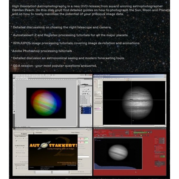 Son más de 2,5h de procesado con las técnicas más novedosas. Sale a la venta en noviembre de 2014. Contiene un repaso en profundidad a Autostakkert 2 y Registax en su última versión (6)
