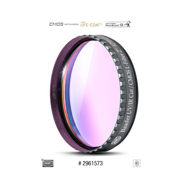 Filtro de corte UV/IR (L) de 2" optimizado para cámaras CMOS. Con una transmisión del 98% en todo el espectro visible de 420 a 685 nm, filtra la radiación en el rango del espectro infrarrojo y evita las imágenes de estrellas borrosas con cámaras digitales, CCD y CMOS sensibles al rojo.