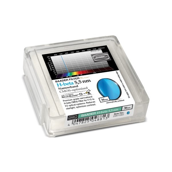 Este filtro de Baader de Hb tiene 5,5nm de paso de banda que darán bastante contraste en las fotografías de nebulosas que emitan en oxígeno.