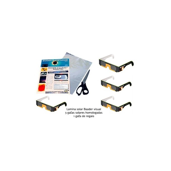 La lámina Baader de visual es una lámina que se pone en la parte frontal del telescopio u objetivo de cámara de fotos y sirve para poder ver el sol en visual en luz blanca. Te permitirá ver detalles de su superficie así como las manchas solares y por supuesto los eclipses parciales, totales y anulares. También se pueden hacer fotos con esta lamina.