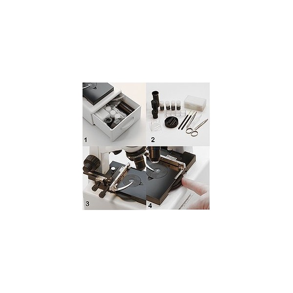 El microscopio incluye un objetivo torreta triple (4x, 10x y 40x), función de condensador conmutable con rueda de diafragma, filtros e iluminación doble (por debajo y por encima) de los iluminadores de LED.