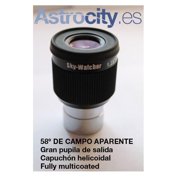 Ocular de 6mm super wide angle, especial para planetaria a gran aumento. 58º de campo aparente para una visión lateral amplia. Capuchón helicoidal ajustable para eliminar la luz lateral y acomodar el ojo y doble tratamiento optico, fully-multicoated. Lente grande (gran pupila de salida) para poder observar con comodidad, y buen relieve ocular de 20mm que lo hace cómodo