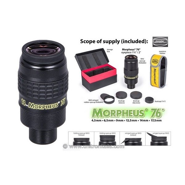 Una nueva opción de distancia focal de 14 mm se suma a la serie Morpheus. Como todos los de la serie este ocular ofrece espectaculares propiedades opticas que potencian de forma sorprendente los resultados de las imagenes. Son factores determinantes en este sentido la calidad de su revestimiento de la firma Phantom Group que facilita una alta transmisión luminica y un altisimo contraste.