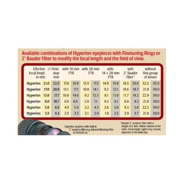 Oculares Hyperion de todas las focales, 5mm, 8mm, 13mm, 17mm, 21mm, y 24mm. 7 lentes en 5 grupos con 68º de campo aparente y una gran versatilidad. Gran campo, gran pupila de salida, acepta foto por proyección, admite extensores y puedes usarlo a 1,25" o a 2" dando bajo aumento a 2". Versatil e inmejorable calidad-precio!