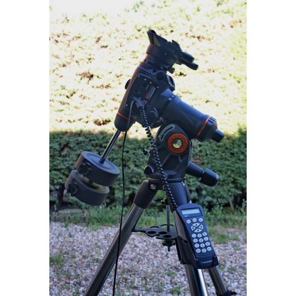 OPORTUNIDAD 2º MANO - BUEN ESTADO. Montura ecuatorial computerizada Celestron CGEM, con muy poco uso. Cuenta con trípode de acero de 2” y está preparada para soportar 40 libras de peso. Motores y electrónica diseñados para tubos de hasta 18 kg. La montura y las pesas han estado siempre guardadas en cajas estancas Stanley, especialmente adaptadas para su almacenaje y transporte.