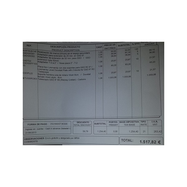 Tubo Ritchey-Chrétien GSO con 8" Carbono, segunda mano. Con soporte hembra cola de milano, Vixen 8cm. Pletina Losmandy Grabado el círculo en espejo secundario. Adaptadores que incluye: extensión de 25mm. y 50mm. Astrógrafo profesional para objetos medianos y pequeños, rápida aclimatación, muchos extras, oportunidad mitad de precio. Producto para recoger en almacén y pago en metálico.