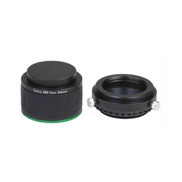 Reductor de focal y corrector de campo para el telescopio SkyWatcher Evolux 82ED. Con este reductor podremos hacer fotografías con un campo corregido de hasta 30mm de diagonal dejando el telescopio de f/6,45 a f/5.8 gracias a su 0.9x de factor de reducción. La distancia focal resultante pasa de los 530mm de serie a 477mm.