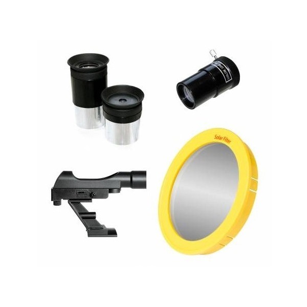 La completa equipación del equipo que incluye: dos oculares Kellner de 24 y 20 mm, lente de Barlow 3x, buscador Led, adaptador para smartphone y filtro solar; garantiza una sencilla y satisfactoria experiencia desde el primer uso.