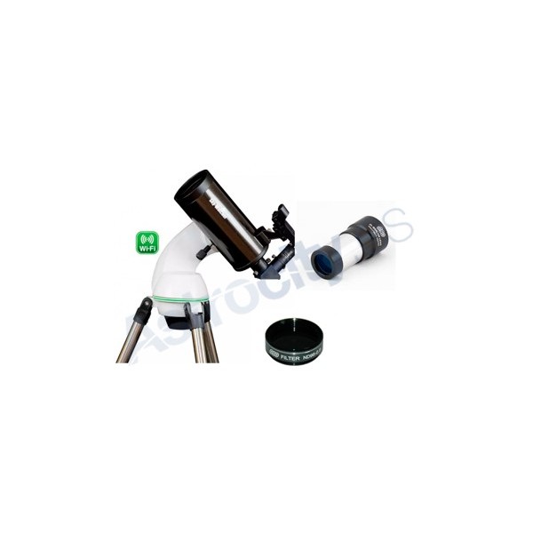 Este kit se compone del telescopio Mak102 AZGo2 junto a un filtro lunar para ver la Luna con comodidad y una barlow 2x para ir al doble de aumento y ver los planetas bien grandes.