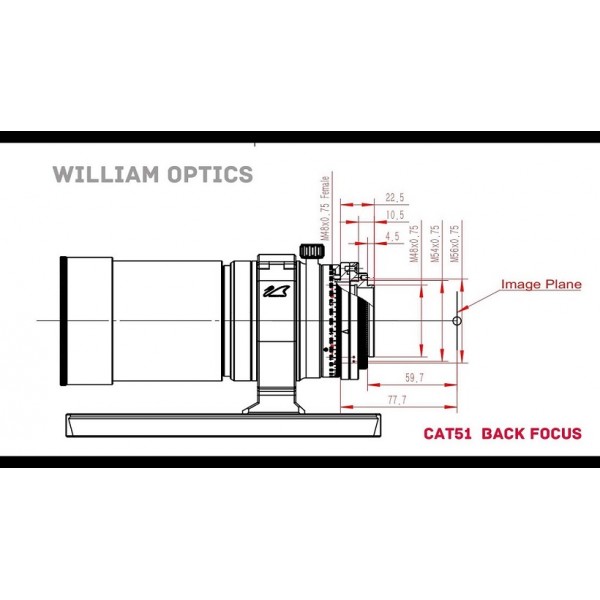 Su relación focal de f/4,9 permite tiempos de exposición muy cortos y su rosca de M48x0.75 disponible en la parte posterior permite conectar cámaras DSLR mediante una anilla T2 o cámaras dedicadas. El backfocus desde esta rosca hasta el sensor de la cámara es exactamente de 59,7mm. Esto es ideal para todas las cámaras dedicadas y para cámaras DSLR.