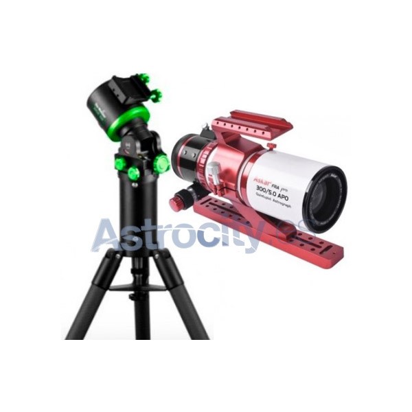 Este conjunto incluye el telescopio Askar FRA300 junto con la montura SkyWatcher Wave 100i, un trípode de fibra de carbono y una columna extensora para elevar la montura.