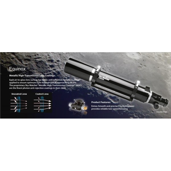 El Equinox 100 ED Fuorita FPL-53, está diseñado principalmente como un instrumento visual y astrofotográfico de alta potencia, en alta resolución. El Equinox 100 ED cuenta con un conjunto de lentes (doblete apocromático) con una distancia focal de 900 mm. Proporciona unas vistas increíbles de los objetos del sistema solar, y más contraste y brillo en los objetos del cielo profundo. Con este tubo se pueden resolver hasta las estrellas dobles más lejanas con facilidad. Las lentes Schott que incorpora con FPL Fluorita, nos dan una idea del potencial de esta máquina. Schott es líder mundial en la construcción de vidrio de ultra baja dispersión. Disfruta con este tubo de la mejor óptica de precisión para astrofotografía. Basta ver el ejemplo de la foto adjunta del observatorio astronómico de Gran Canaria (OAGC) con un equinox. El equinox 100ED refleja un 99,5% de luz gracias a sus lentes Scoch y su "Recubrimiento metálico de alta transmisión" (MHC) el mejor de su clase. Características estándar: Diámetro: 100 mm / Distancia focal: 900 mm / Relación focal F9 Óptica de alto contraste y ultra baja dispersión EDDewshield de aluminio retráctil Anillas para el tubo y de cola de milano incluidasSoporte del buscador. Maletín de aluminio para un transporte fácil y seguro. Enfocador de doble velocidad Crayford ajustable en 360 grados para facilitar el encuadre de los objetos en las fotografías. Escala graduada en el tubo para un enfoque rápido y preciso con el CCD o cámaras réflex digitales. Máximo aumento (potencial con buen seeing):300x Enfocador Crayford Dual speed sin holguras y con enfoque 11:1, de 2” con enfoque ajustable de 2 "a 1.25" Adaptador ocular (con anillos de compresión de latón) Tapa parasol de aluminio Lentes Multi-Coated (Un FPL-53, ED) Uno de nuestros tubos preferidos. De los pocos que satisface una observación visual y un uso astrofotográfico de alta precisión. Transportable y en oferta en Astrocity.es